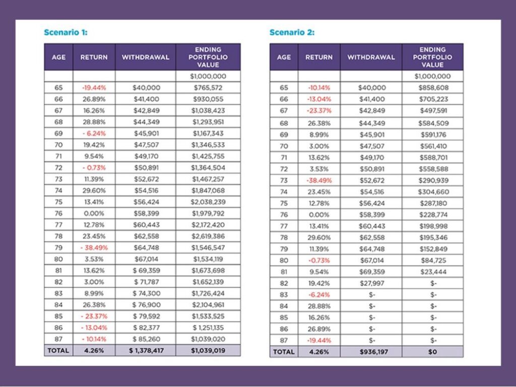 In both scenarios, the ending portfolio value is based on a retiree who retires at 65 with $1 million and withdraws 4% per year plus a 3.5% annual increase for inflation each year through age 87. In Scenario 2, the actual S&P 500 Index, our retiree would have run out of money at age 82.